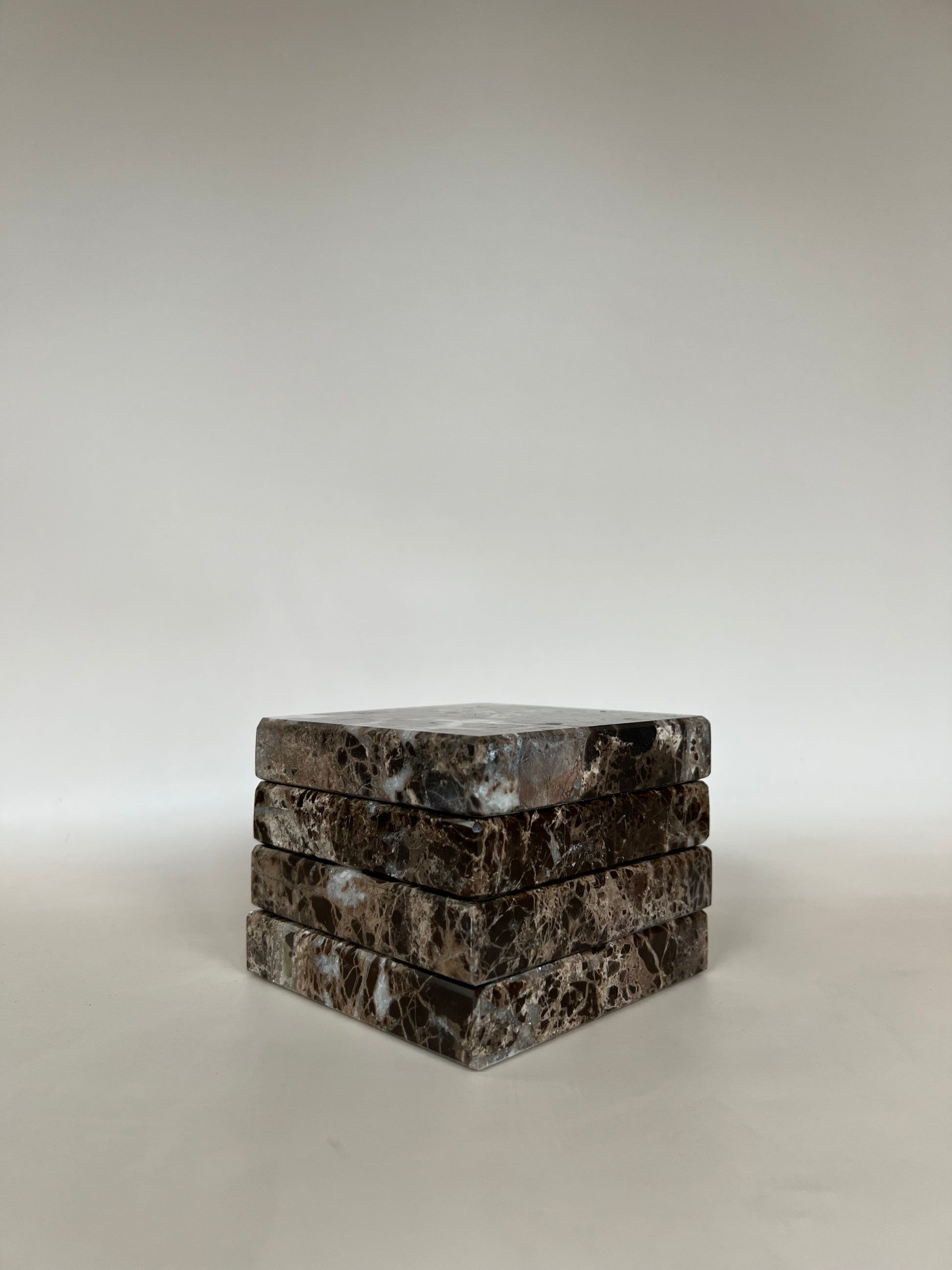 Elevate your surfaces with the natural beauty of our Espresso Coaster, crafted from Dark Emperador marble — a rich, deep-toned stone quarried in Spain. Its warm earthy browns and striking veining make each coaster wholly unique, adding a timeless, refined touch to your surfaces. This off-cut slab has been given a second life, preventing waste and reducing landfill contribution. Designed to transcend trends, the Espresso Coaster brings both function and character to your daily rituals for years to come.
